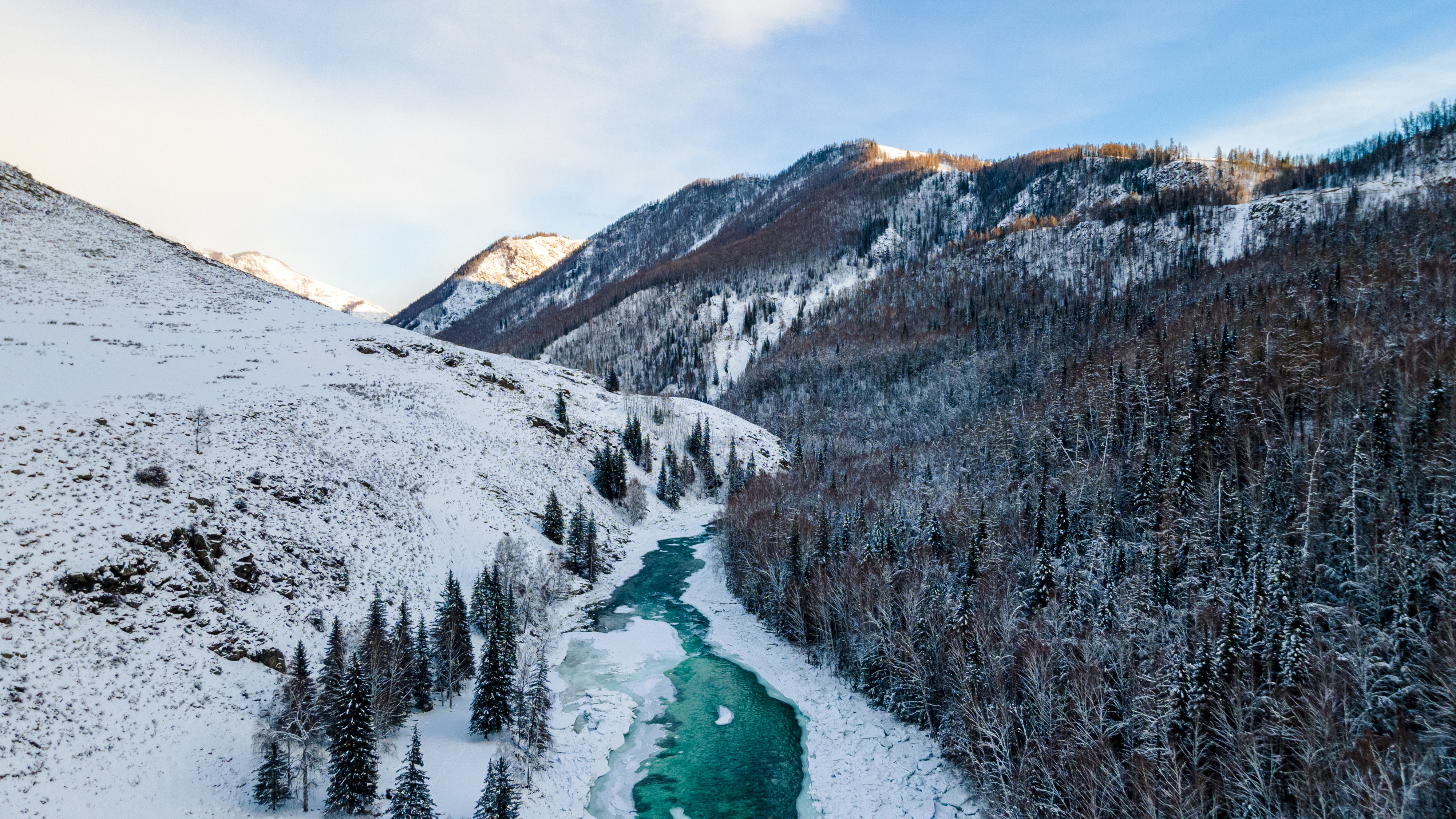 在这里可以看到干净、清冷、孤寂的喀纳斯,在冬日的大雪中,蓝色的湖泊逐渐变得白雪皑皑。